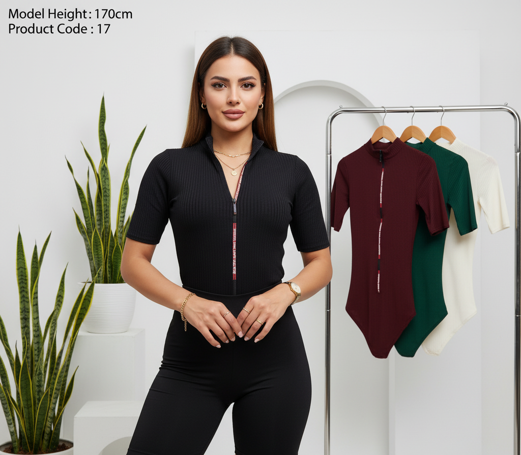 خرید بادی زنانه آستین کوتاه جلو تمام زیپ پنبه آکاردئونی