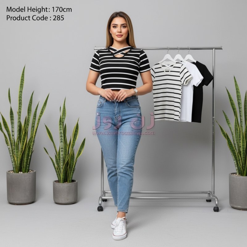 اندازه، جنس، رنگ بندی/سایزبندی تیشرت زنانه یقه ضربدری راه راه فانریپ
